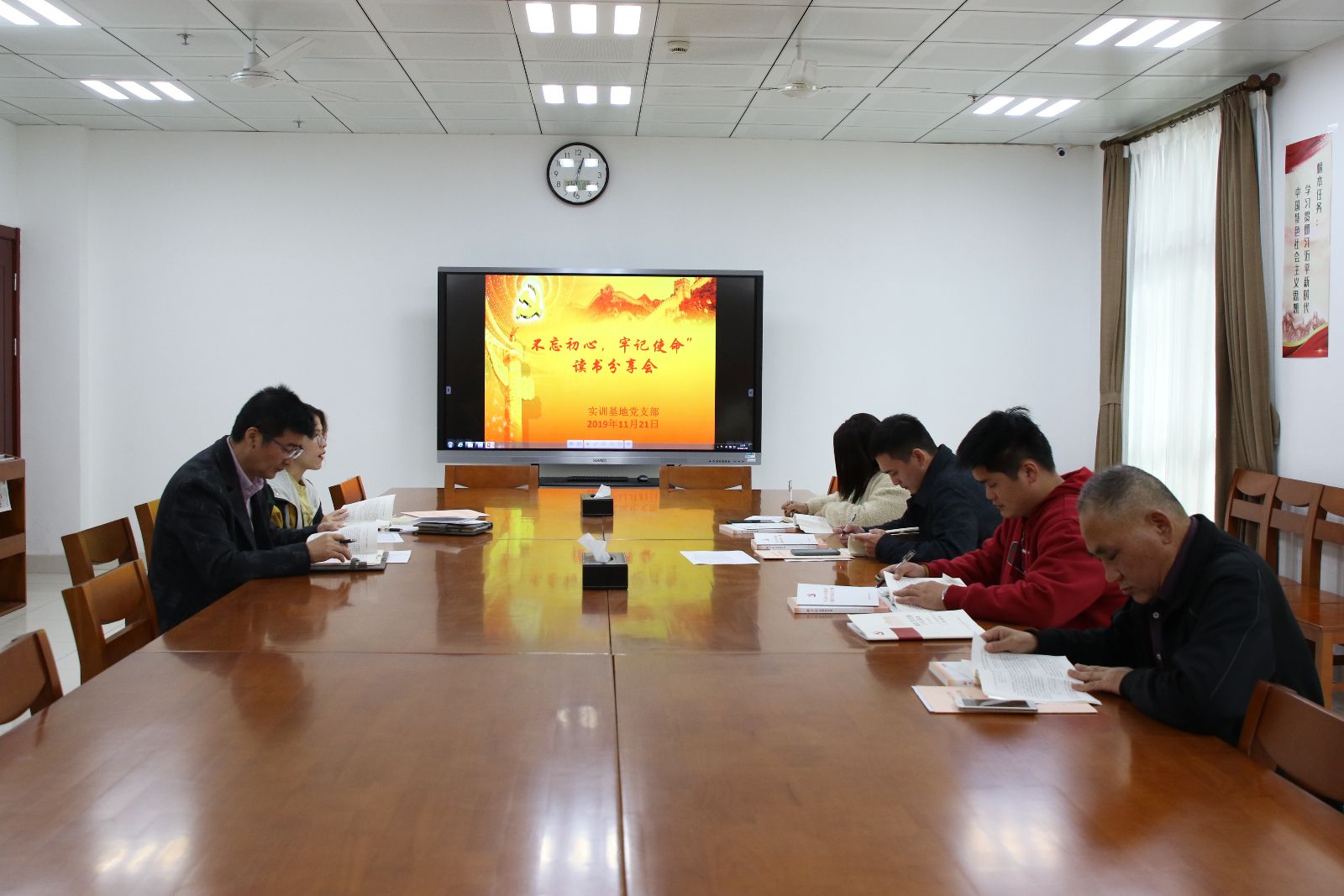 2019年11月21日下午,实训基地党支部举办“不忘初心,牢记使命”主题教育读书分享会。