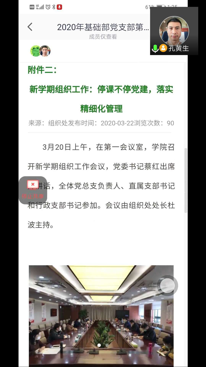 2020年3月27日下午13点30,基础部党支部在腾讯视频APP召开2020年基础部党支部第一次会议。